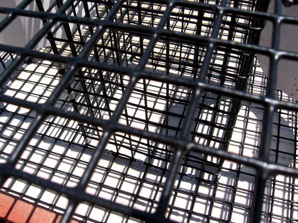 I got some cool photos yesterday when I walked past new lobster traps on a pier. The cage-like traps and their shadows, which were cast on a clean flat surface, created an illusion of strange dimension and space that captured my eye.