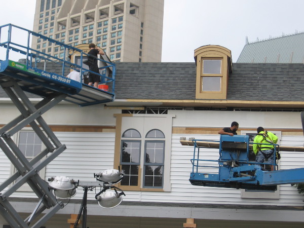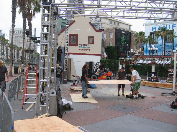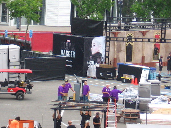 Equipment for the Conan O’Brien show during Comic-Con is being moved into the Spreckels Theatre.Snoopy graphics on the windows of Bubbles Boutique have transformed it into the Peanuts Pop-Up Shop!A photo of construction progress at The Good Place near the Tin Fish.Petco Park’s Whiskey Cavalier wrap is still being applied.This wrap on Petco Park showing Nathan Fillion promotes the ABC show The Rookie.Getting a tree ready at the Experience at Comic-Con, near the Sacred Lies activation.Marvel’s Cloak and Dagger on Freeform will also have a cool activation at Experience at Comic-Con.A photo from behind the Cloak and Dagger structure.The unusual Legion structure is being finished at FXhibition.FXhibition also includes a cool graphic depicting Archer Danger Island.It appears the courtyard area next to the Hilton Bayfront will be used to promote Mayans MC.In the FOX section behind the convention center, small rooms have appeared featuring Family Guy and The Simpsons.Yikes! The Griffin home is on fire!Walking along the bayfront toward the Adult Swim offsite two days before the official opening of 2018 San Diego Comic-Con.Rick sculpture now stands over a miniature golf hole.Looks like the archery range of Adult Swim State Park.Bandai is building a castle-like structure on Marriott’s Marina Terrace.Some awesome Bandai figures are now being set up at their offsite.SDCC 2018 exhibitors and fans are arriving in San Diego! Two days to go!The Mellow Tiger Bar will occupy part of Hulu’s Castle Rock offsite.The Castle Rock bed and breakfast is getting a paint job!The New Children’s Museum now has yellow Syfy umbrellas and signs ready, including one for the Human Claw Machine.Comic-Con paintings by the artist Suzka can be found inside Simon’s Cafe, just north of the Jack Ryan Experience. This piece is titled The Joker Card.One guy wearing cammies is relaxing at Amazon’s Jack Ryan Experience offsite.Looks like Kenny died yet again outside the South Park escape room.That big slide at Dead Quarters will be mounted here.Taco Bell was getting their Demolition Man pop-up ready in the Gaslamp. Everyone smiled for some free publicity! Nacho fries will be served.A couple of building wraps promoting Disenchantment on Netflix are being applied to the Hard Rock Hotel.