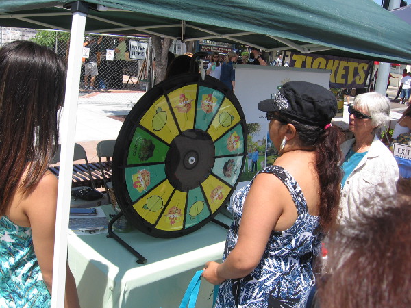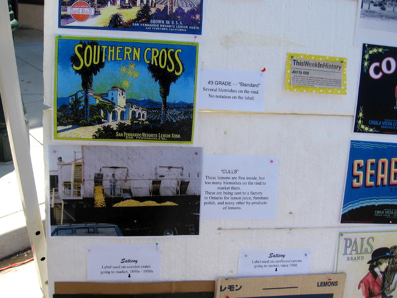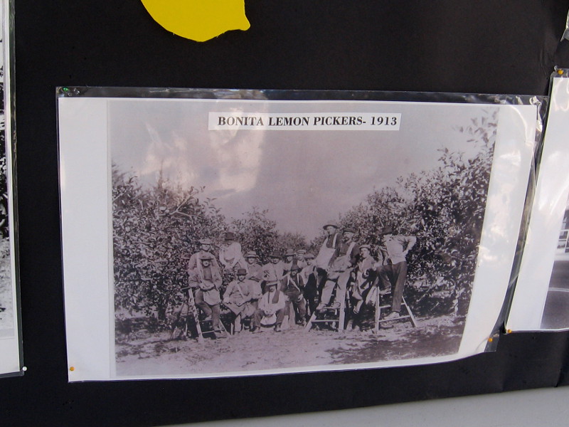 About 50,000 people would turn out for the yearly lemon-themed event.These ladies had all sorts of sweet lemon treats for sale.Some friendly people from the Restored Church posed so that a blogger could take a funny photo at their Lemon Festival booth.Artists at the Lemon Festival had all sorts of colorful artwork for sale that contained bright yellow.This lady registering people to vote had a cool lemon slice umbrella hat and smile.More ice cold lemonade! Sounds good on a hot summer day in San Diego’s South Bay.Even this funny pooch in a wagon was selling lemonade!The Chula Vista Historical Society had a booth with books and fascinating information.Their display showed Chula Vista’s agricultural past. Many growers and packing companies once exported lemons around the world. Some of the beautiful old crate labels have become valuable collectibles.The display explains different grades of lemons, including culls, which were blemished, and used to make juice, furniture polish, and other lemon by-products.The festival had just started and these ladies with the Third Avenue Village Association, that puts on the popular event, were almost done decorating their booth.Another booth at the Chula Vista Lemon Festival featured lots of interesting historical photographs.Someone points to a photo of workers in a lemon grove at the Higgins Ranch in Keen Valley, 1901.Aerial photo of the Boltz lemon ranch in the mid 1920’s.Typical Chula Vista lemon packing plant, circa 1920’s.Old photos of Chula Vista streetcar and train at Third Avenue.Bonita lemon pickers, 1913.Meanwhile, people spin a lemon-themed prize wheel at the festival.At the Lemonade Bandstand, entertainment included live music, a largest lemon and lemon peel contest, a lemon costume contest, and lemon pie eating contest.People watch the Lemon Squeezers play rock and roll music with a twist!Cool local band, the Lemon Squeezers, at the Chula Vista Lemon Festival.That great music has people smiling and dancing!Batman and Wonder Woman dropped on by and posed for a photo by the Lemon Bar sign.All that fun has made me thirsty for some lemonade!