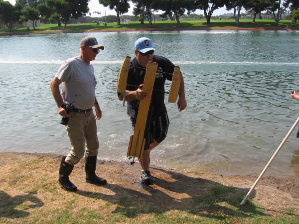 I spoke to a few people and watched several races. I learned that the model speedboats are built from kits, and that the different classes are determined by the size of the boat. I observed that after contestants are told to start their engines (which at times is problematic) there is a countdown to the beginning of the race. After tossing their boats into the water, it appeared that getting in optimal position for the start was an important aspect of the strategy.
