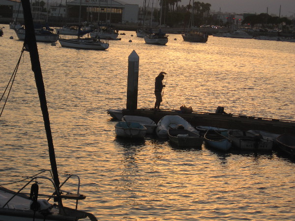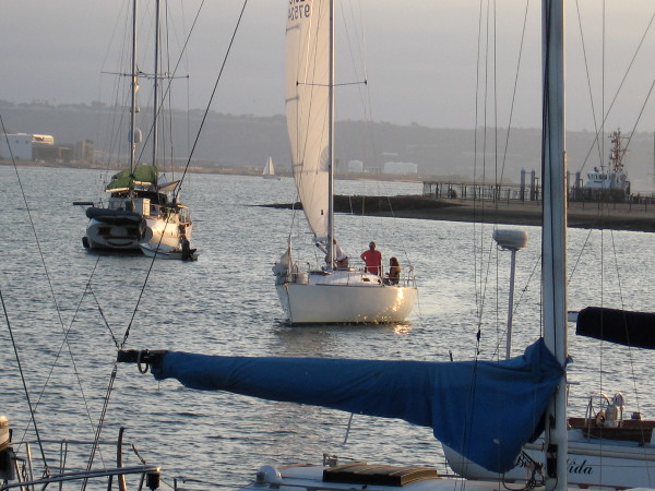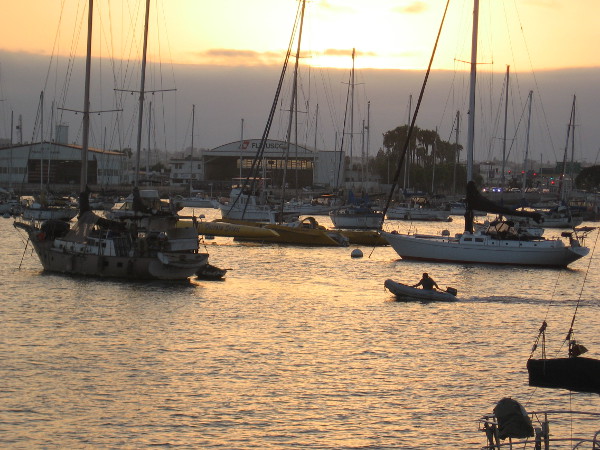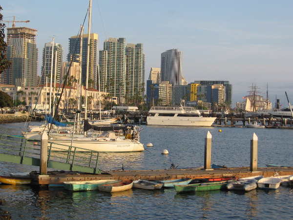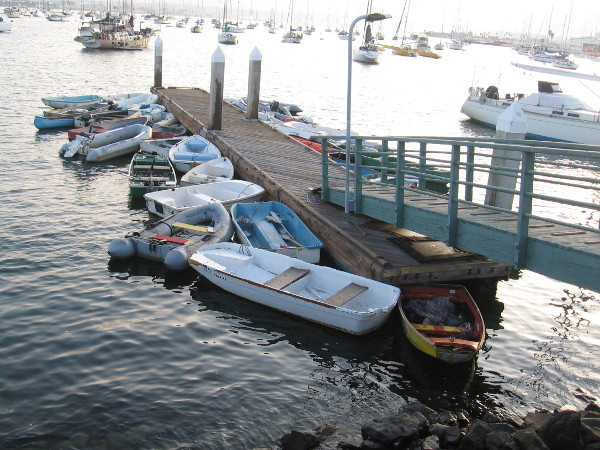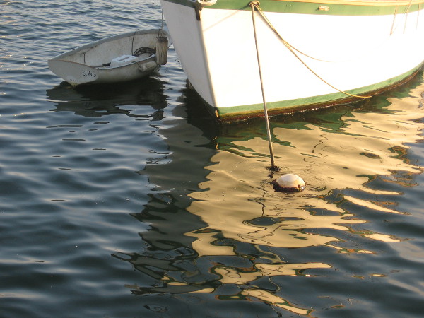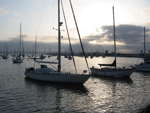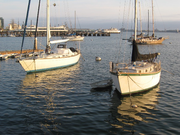 Late sunlight reflected from the boats moored in the Crescent Area of the North Embarcadero.