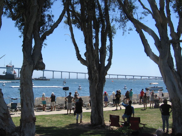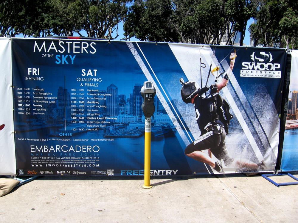Here comes another competitor. Helicopters took parachutists high above the water, and the crowd shielded their eyes from the sun to see them descending.Vying for the World Championship of Swoop Freestyle, this competitor approaches the floating platform, just off Embarcadero Marina Park South.One of the athletes is cheered by the crowd after making their dramatic swoop!A banner at the event shows the weekend schedule. The amazing Masters of the Sky wowed lots of excited Swoop Freestyle fans.I was told Swoop Freestyle athletes came from 13 separate countries to vie for the World Championship.Testing a parachute in a section of the park where Swoop Freestyle contestants prepared and boarded a helicopter.Lots of fans in attendance had a special interest in skydiving. They came to watch this unique sporting event from far and wide.Some people were enjoying a VIP section.Here comes another canopy. In mere seconds there will be another daring swoop!Members of a Rescue Team were out on the water, but during the time I watched, they weren’t needed.Crash! This competitor let everyone know he was okay right away.Here comes another swooper!Flying with feet skimming the water’s surface, approaching the floating platform. I don’t recall the result of this swoop.Will this swooper make it to the platform? Some contestants, unfortunately, miscalculated and came up short.More great Swoop Freestyle action out on San Diego Bay.Sometimes two swoopers would come in simultaneously. There was a lot of exciting, intense drama!After sitting on a hard rock for a long time, I wandered around to stretch my legs. Here’s the entrance to the VIP section.Several sponsors and vendors had booths around the park, including Skydive San Diego.Here come a couple of paragliders doing a demonstration during a break in the Swoop Freestyle competition.Paragliding slowly toward the platform. I always enjoy watching paragliders soar along the cliffs above the beach at the Torrey Pines Gliderport.The live music guys were taking a break when I walked by, but did a rocker pose for my camera!There was a fun demonstration by two daredevil water jetpack guys.Entertaining the crowd!Flying through the air without a parachute!Now that really looks like Superman! Where’s the cape?Three guys demonstrated zooming through the San Diego sky in wingsuits. They looked to me like flying squirrels. Unfortunately, I got my photo after their chutes deployed.Here they come. Splash.A couple helicopters were flying back and forth across the bay during much of the event. The Swoop Freestyle competition is about to resume.Here comes one swooper. This competitor angled in really close to the crowd.Flying inches from the water.Here comes another. As you can see, it was a typically perfect San Diego day for the event.Swooping on in. I think this contestant was too far from the platform and came up short.Here comes another Swoop Freestyler. Nice form!A perfect landing! This guy received a high score and with his performance became a contender for world champion.Excitement at a great athletic achievement!Some fans were waving a national flag for one of the Swoop Freestyle international athletes.As the crowd watched the action, behind the scenes the athletes were preparing parachutes and getting ready for their competitive jump.A huge tent contained lots of parachutes. I’m not sure if these were drying out, awaiting use, or what.Will this be the next World Champion of Swoop Freestyle?Heading off in a helicopter to take another flying swoop.Here’s a distant action photo into the sun from a spot near the Hilton, behind the San Diego Convention Center.Didn’t quite make it onto the platform! Close but no cigar!But he still gave me a smile and thumbs up!Excitement is nonstop at the 2018 Swoop Freestyle World Championship!