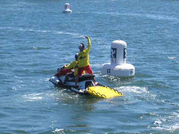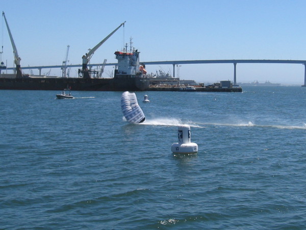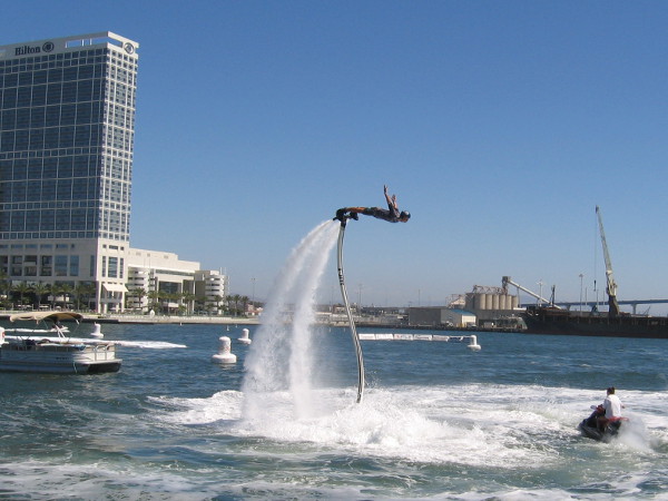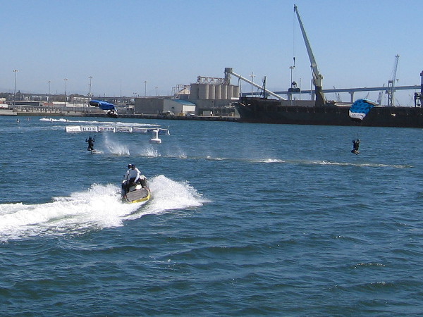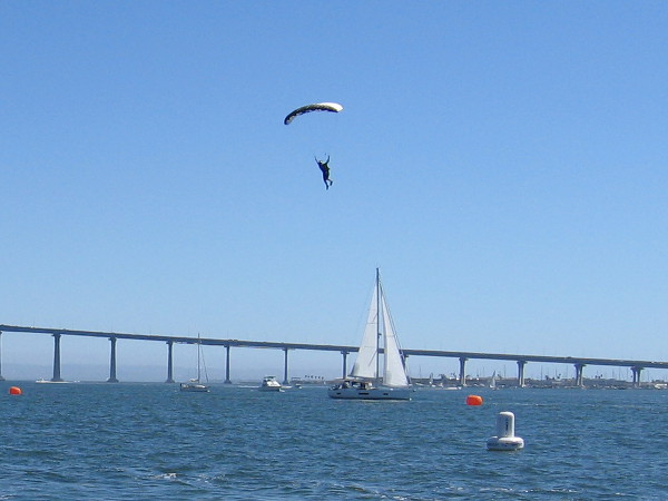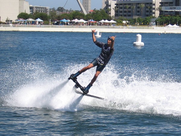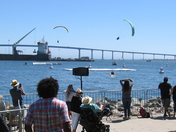 Someone watching the Swoop Freestyle FAI World Championship on San Diego Bay points to a competitor skimming across the water!