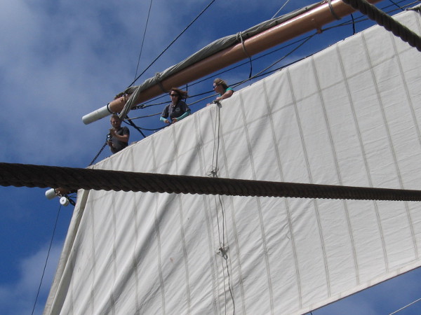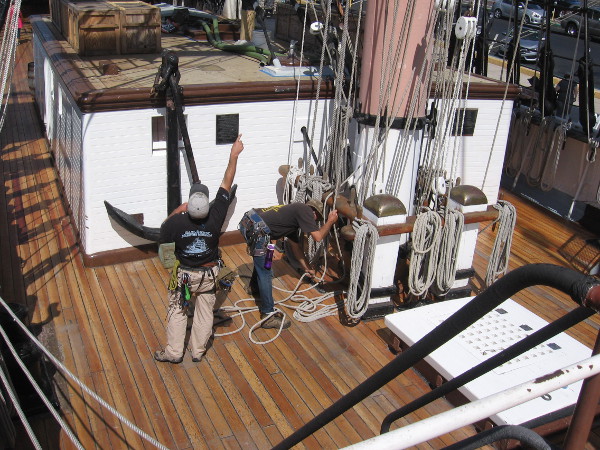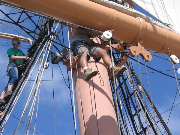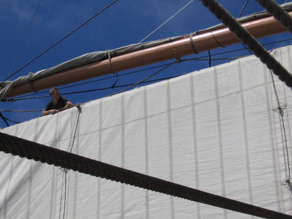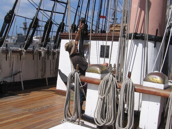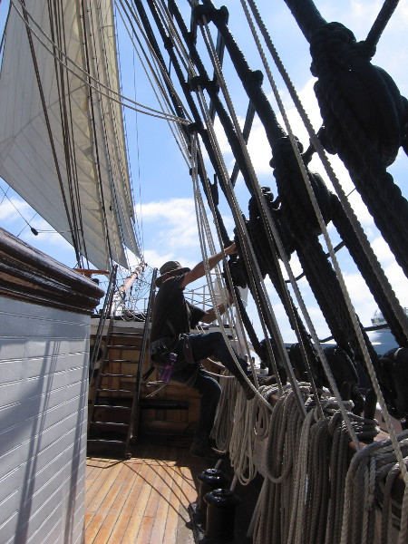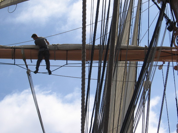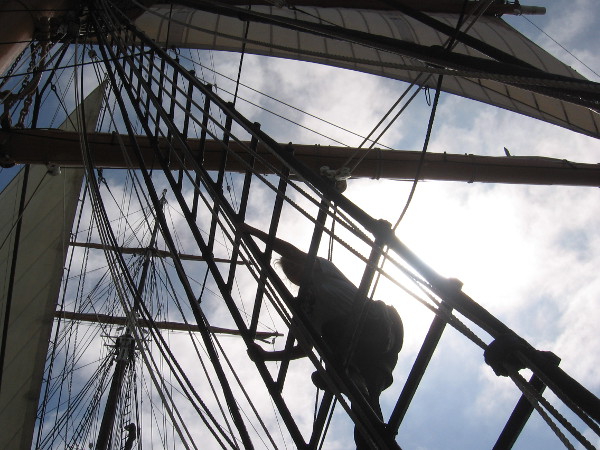 This afternoon the Star of India’s sail crew was high up in the rigging practicing. From the deck below I watched as they set sails, squared yards, and performed some of the acrobatics aloft that are necessary to perform their duty with coordinated precision.