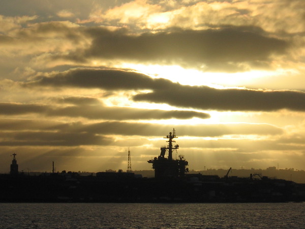 As sunset approached, slanting rays of light seemed to crown the USS Theodore Roosevelt, now docked across San Diego Bay at North Island.