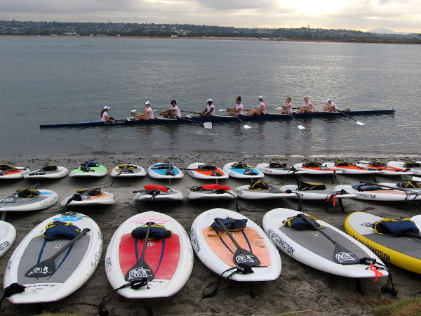 Early this morning I headed to Ski Beach Park, on Vacation Isle at the center of Mission Bay. I wanted to take photographs of a dramatic post-storm sunrise, and people out on the silver water rowing to cure breast cancer.