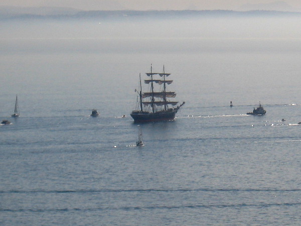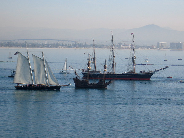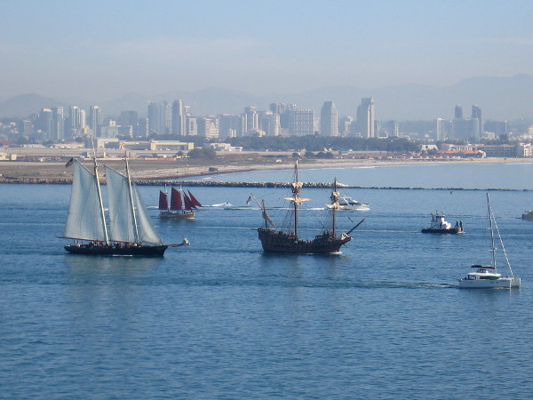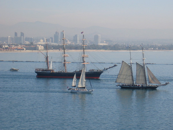 A magical vision of historic tall ships seen from the end of Point Loma. Time's curtain seems to open, and we peer into the past.
