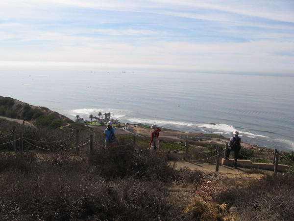 People walk down Cabrillo National Monument's Bayside Trail in order to watch a bit of sailing history.