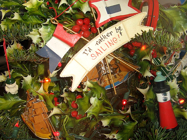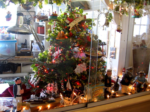 A bright Christmas tree is ornamented with ships, boats, signal flags and lighthouses. It even appears that Santa Claus has been repairing and cleaning one model ship in the small workshop. I guess his elf helpers are busy making toys up at the North Pole!