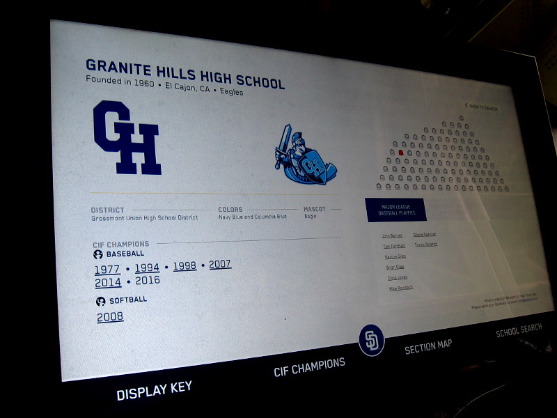To honor the achievements of local teams and their individual players, two interactive screens in the San Diego Section allow fans to search by high school. Basic information is displayed for each school, such as team logo, colors and mascot. The years the school won a California Interscholastic Federation Championship are also shown, as are the names of students who’ve have gone on to compete in Major League Baseball!