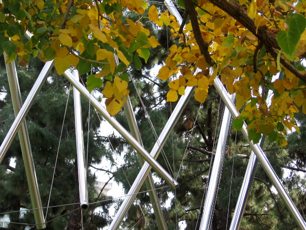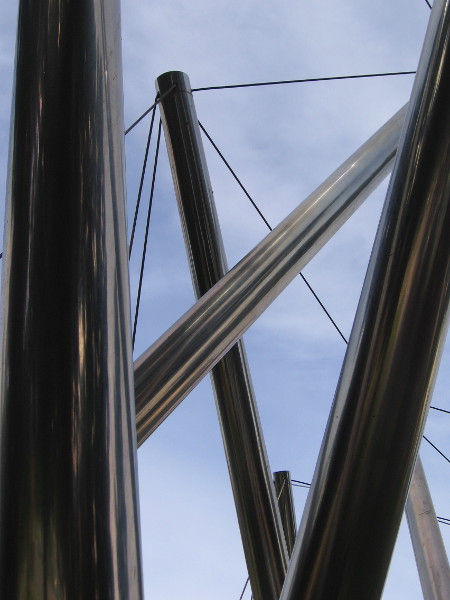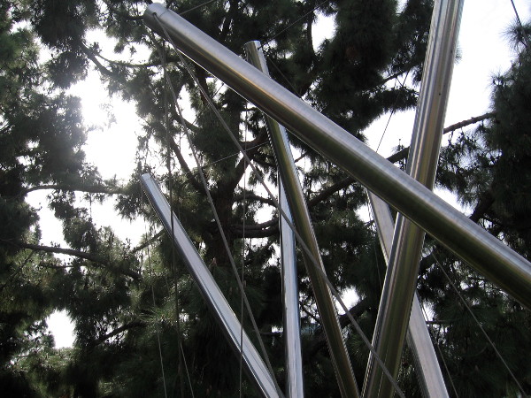 The stainless steel sculpture stands atop a small grassy hill among trees near the intersection of Park Boulevard and B Street. Reflecting sunlight, its angled lines form a shining mystery!