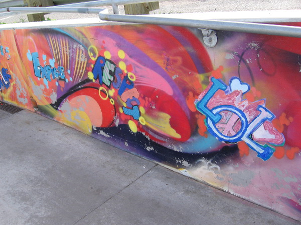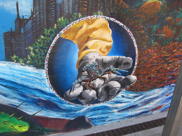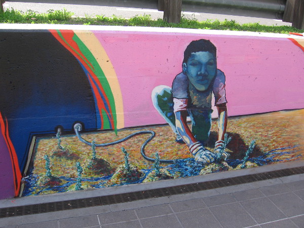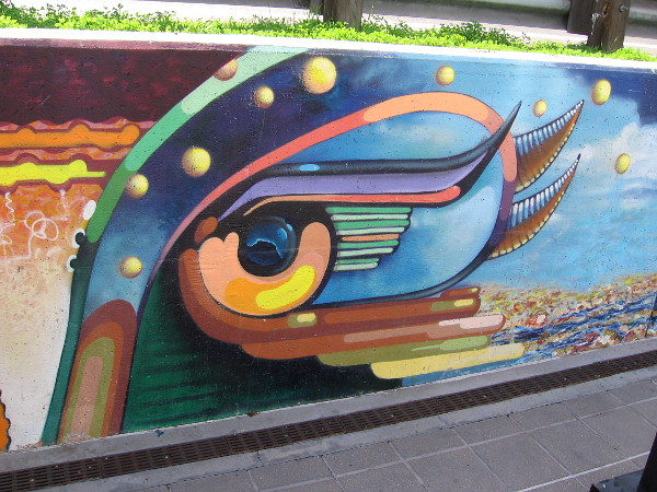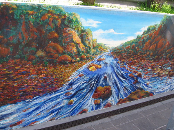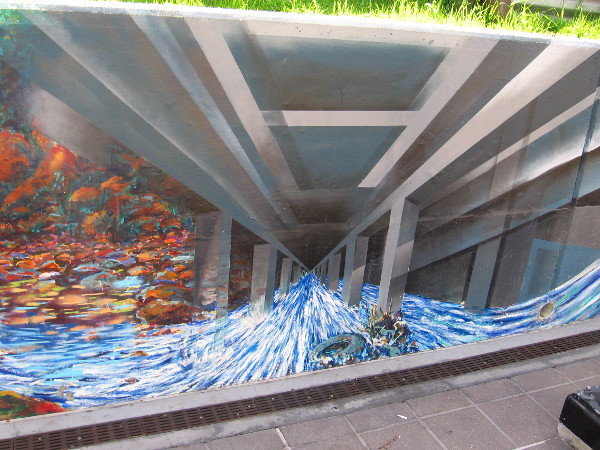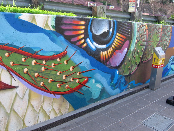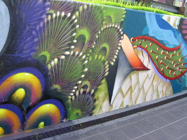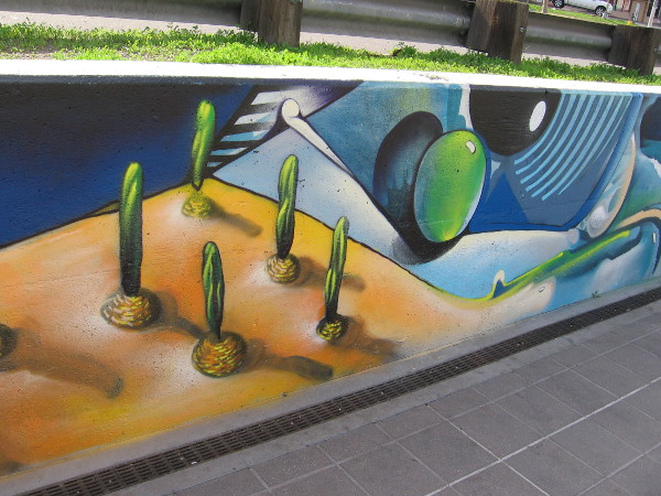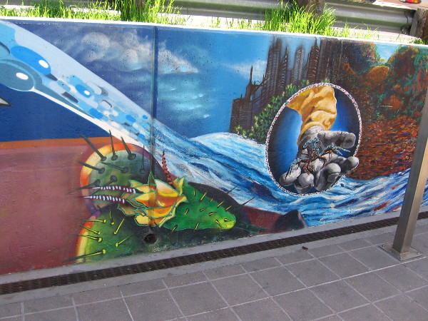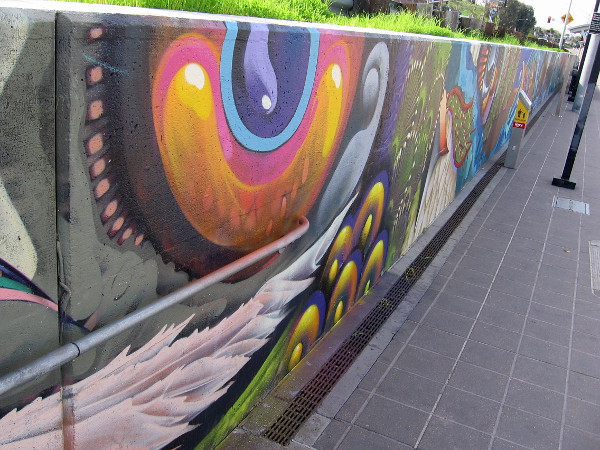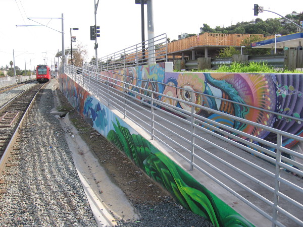 Those who take the Orange Line trolley ride pass by a wildly imaginative, dreamlike vision. A 400 foot mural on the long wall of the south platform takes its inspiration from nearby Chollas Creak. The mural is titled Liquid Harmony.