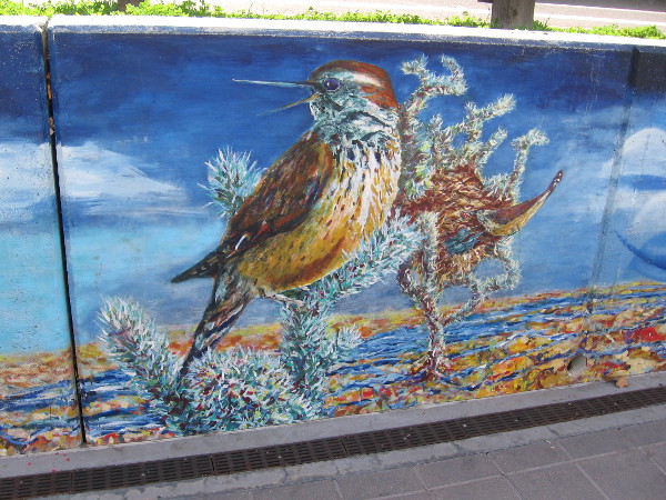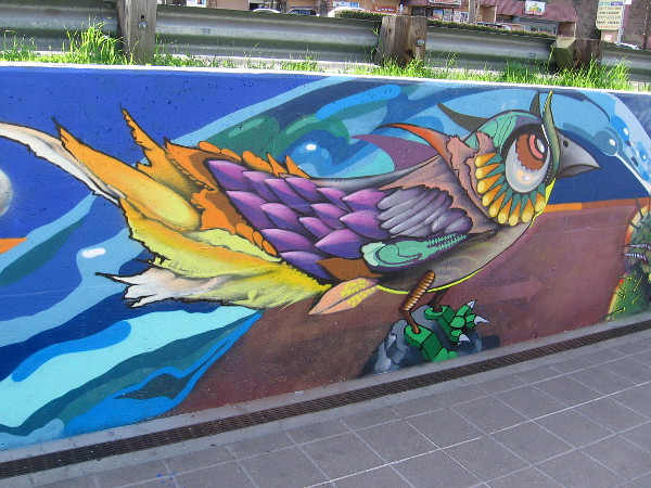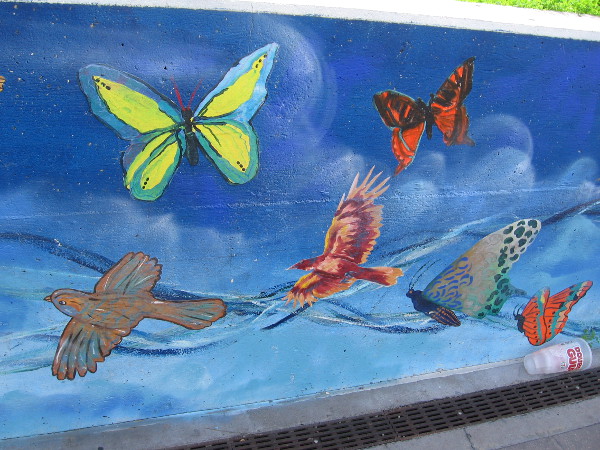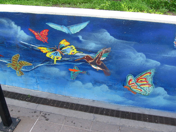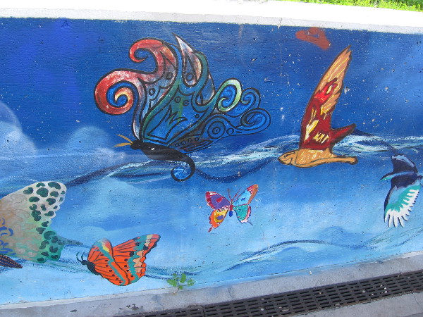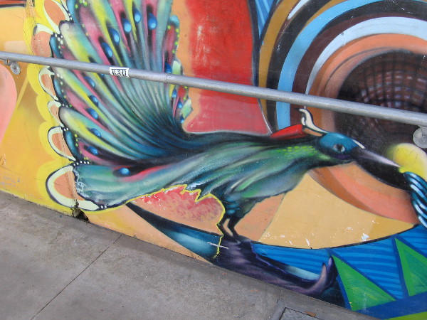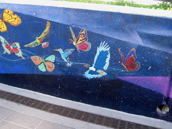 Last weekend I walked along the south platform of the 62nd Street/Encanto trolley station and took photos of the mural. Amid swirls of color I found many birds, insects and plants, and the flowing, ever-present, life-giving water.