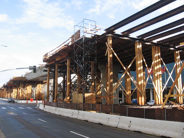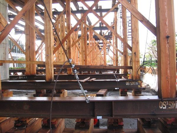 As I took photos, I was fascinated by the strangely beautiful complexity. Layers of geometric shapes can be observed in the wood, concrete and steel supporting construction of the elevated tracks and station.