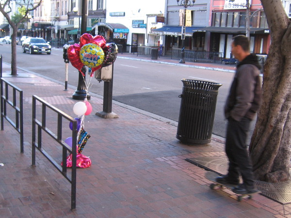 The cluster of balloons moved slowly down the sidewalk, propelled by a gentle breeze. Occasionally they’d float upward a foot or two, then quietly float back to Earth.