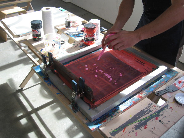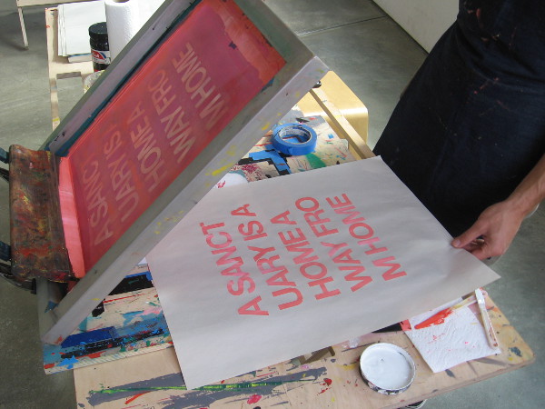 I was welcomed by Max, a super nice Gallery Educator, who was applying ink to a silk screen. He was using screen printing to create bold messages in the Sanctuary Print Shop!