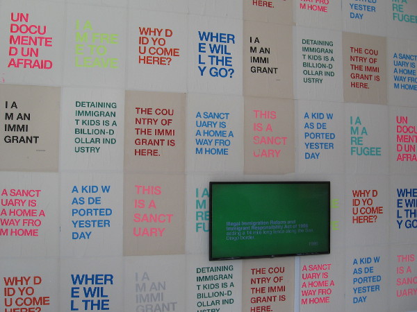 The project titled Sanctuary Print Shop is the brainchild of artists Sergio De La Torre and Chris Treggiari. The idea of this exhibition is to start conversations concerning the very topical and divisive issue of immigration. People are encouraged to write their thoughts about immigration, and messages are created to paper one wall.