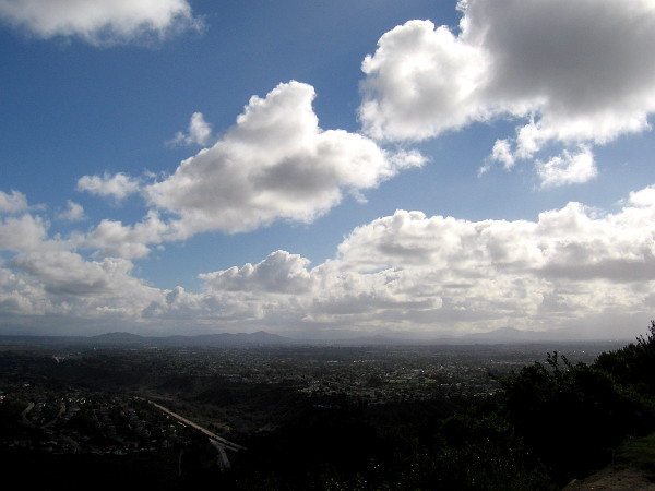 To the north: La Jolla, Del Mar and the Pacific Ocean. To the northeast: University City. To the east and southeast: the distant foothills and mountains of East County. To the hazy south: tiny downtown, Mission Bay and Point Loma.