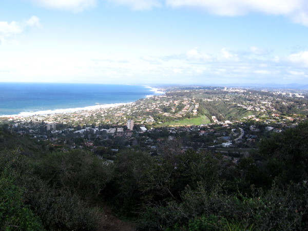 To the north: La Jolla, Del Mar and the Pacific Ocean. To the northeast: University City. To the east and southeast: the distant foothills and mountains of East County. To the hazy south: tiny downtown, Mission Bay and Point Loma.