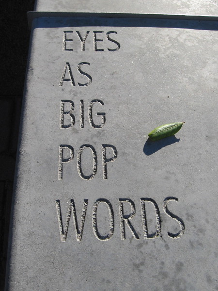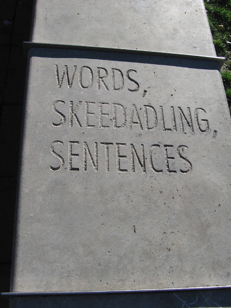 WORDS WALK A PATHWAYINTO OUR MINDS, THEY JUMP QUICKBEHIND A HOPPINGFROG, GUIDING US LIKE A SCOUTINTO THE LANGUAGE WE BOP,WORDS POP BIG AS EYESOF FROGS, WHO HOP AND PLOP, BOPTHROUGH WORDS ZIG-ZAGGINGTHROUGH SENTENCES, HOT AND COOLAS FLIP-FLOPS KIDS ARE WEARING,THEY ARE COLORFUL,THESE WORDS THAT BLIP, BLOP AND PLOP,UP AND DOWN THEY GO,LIKE OUR SCOUT, THE HOPPING TOAD,THERE HE GOES, JUMPING LIKE WORDS,SOME HE TOTES INSIDEA SACK ON HIS BACK, BOUNCING,BROWN-GREEN AS HIS SKIN,THESE WORDS ARE HEAVYLOADS FOR TOADS SAME THING AS FROGSTO CARRY, THESE KNOTS, ZIG-ZAGGING, COOL, WORDS, BOPPING,SKIPPING ALONG, SKEEDADLINGALONG THIS PATHWAY,WE FOLLOW WORDS AS THEY HOPBEHIND OUR SCOUT-TOADOR FROG, IF YOU LIKE THAT WORD,FOLLOW THEM TO WHERE THEY ENDINSIDE THE MUSEUM,WHERE WORDS BECOME FREEDOM, ART,MUSIC AND KNOWLEDGE,POETRY, DANCING, BIG FUN,HIP AS FLIP-FLOPS KIDS HAVE ON