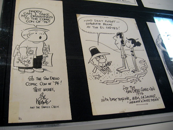 Finally, in several glass display cases you’ll find all sorts of souvenir program book interior artwork: original drawings by renowned artists, cartoonists and illustrators, who over the years have sent their greetings to Comic-Con!