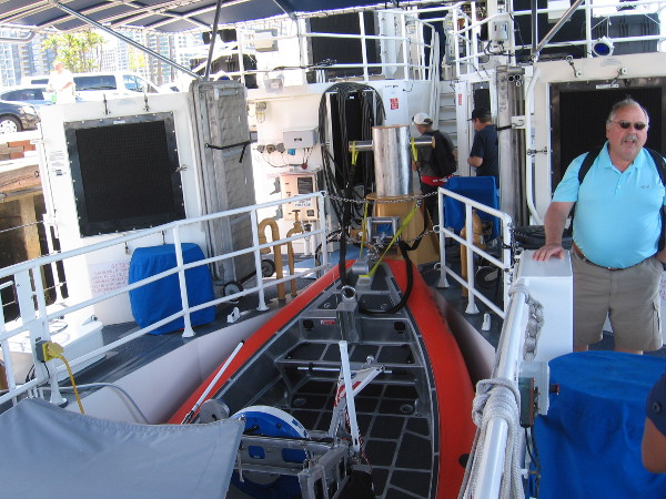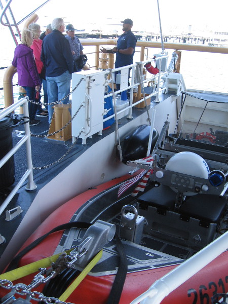 After checking out the pilothouse, our tour headed to the rear of the cutter where a small Cutterboat – Over the Horizon inflatable boat can be quickly released into the ocean or pulled back aboard. With its jet drive, the cutterboat has the ability to pursue and overtake very fast vessels.