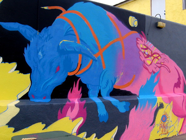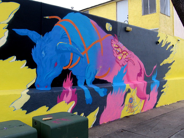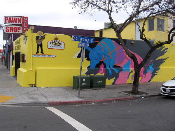 I learned this colorful image of a charging bull is by San Diego artist Hugo Fernando Fierro. While the mural isn’t quite finished, you can’t deny it’s going to be awesome!