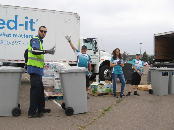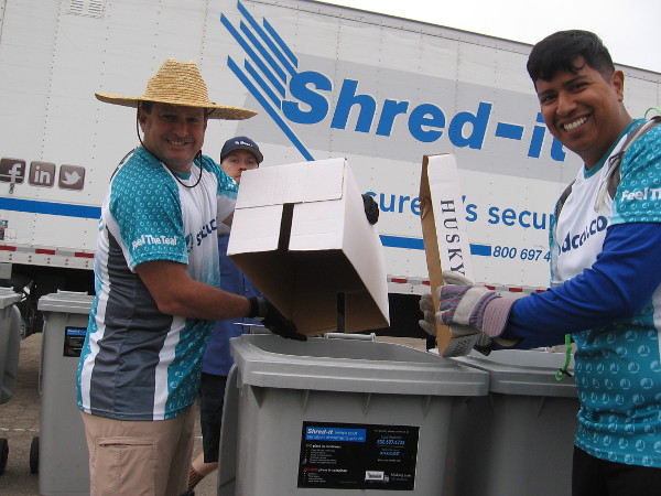 Look at all these smiling faces! My own face is smiling because I got a big box of old documents shredded for free this morning. I drove down to SDCCU Stadium and took part with thousands of others in the enormous Super Shred Event!