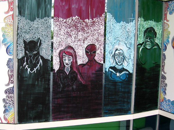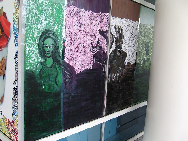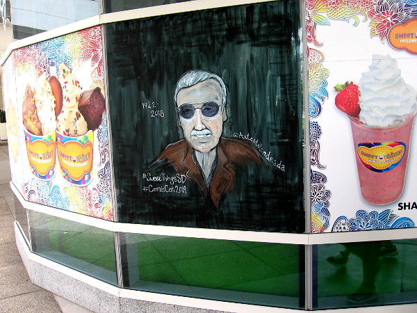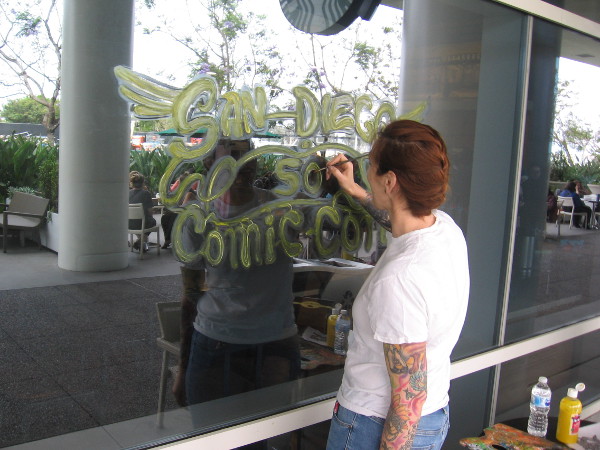 As I walked around the San Diego Convention Center late this morning, I came upon an artist painting the windows of the Sweet Things Frozen Yogurt shop in preparation for Comic-Con, which is now only four days away.