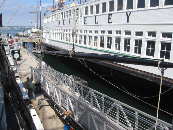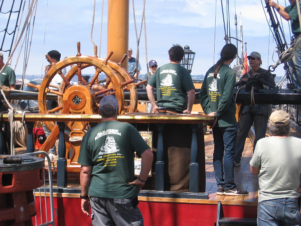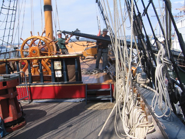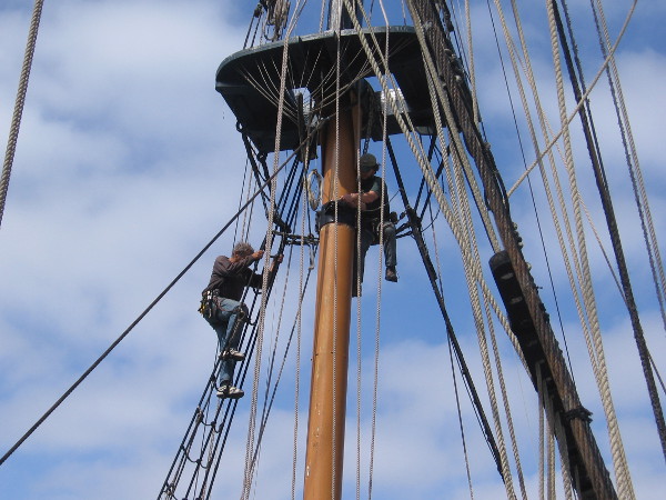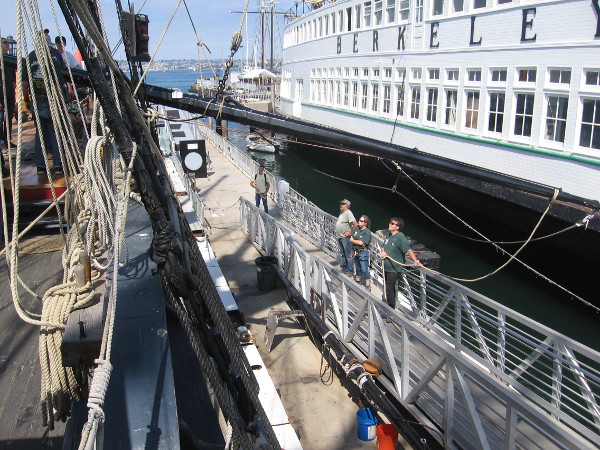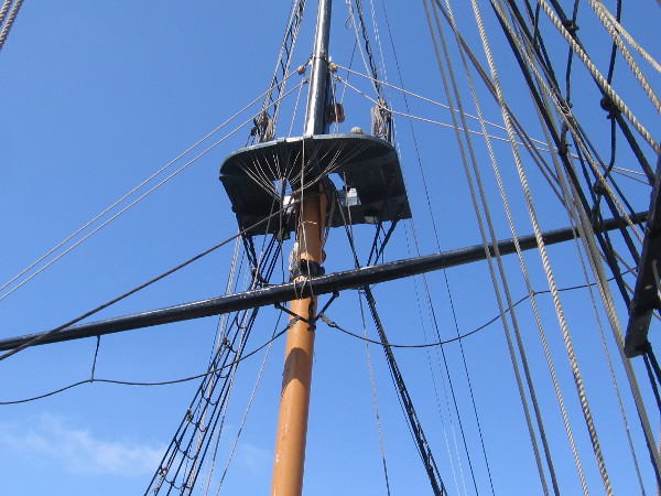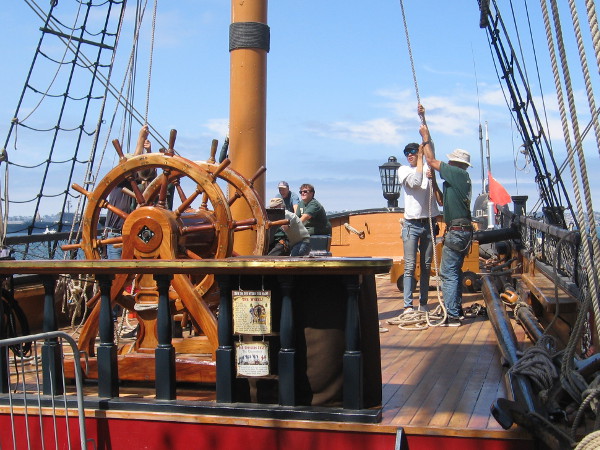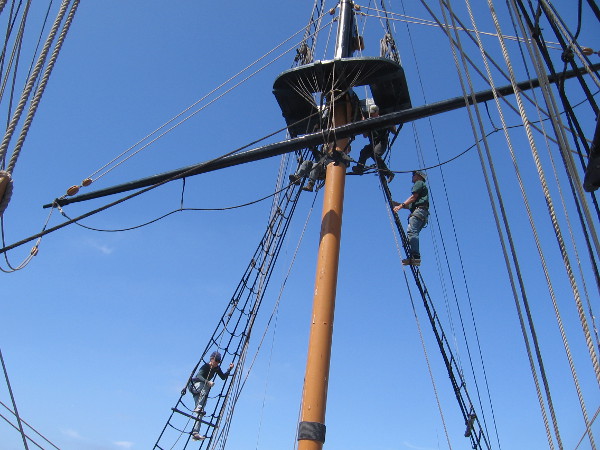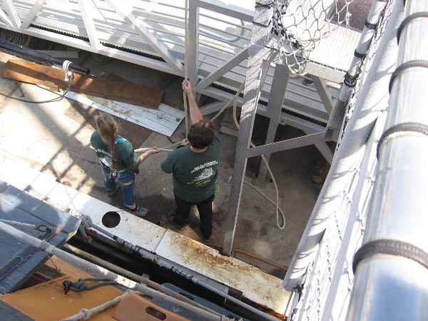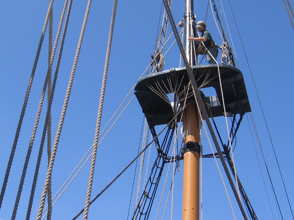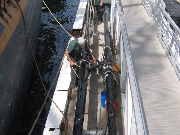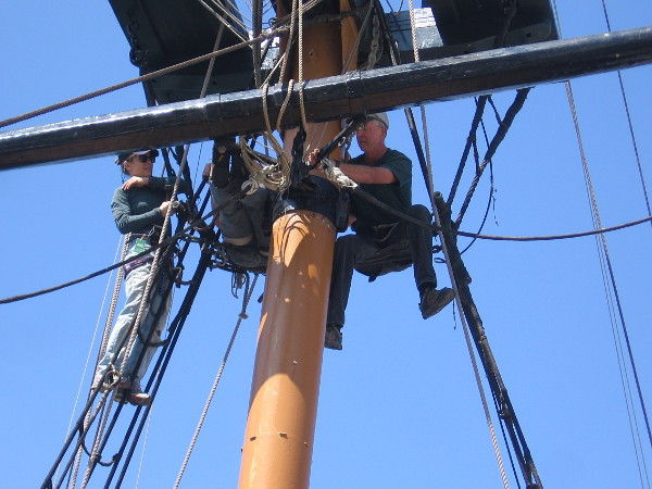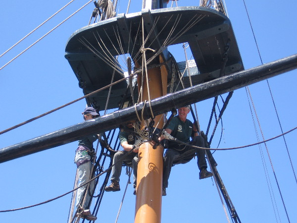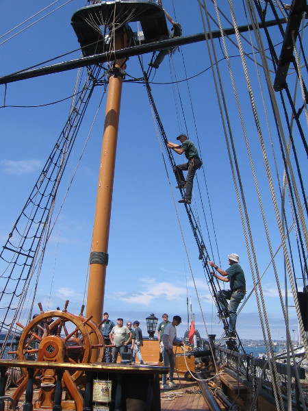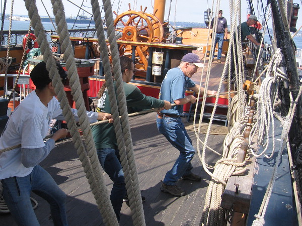 During my Sunday walk along the Embarcadero today, I paused at the Maritime Museum of San Diego to watch some fascinating activity. Crew members and museum volunteers were carefully raising one of HMS Surprise’s very heavy mizzenmast yards. They hauled ropes, checked critical knots, hauled some more, swung the yard up and across the quarterdeck, then lifted it straight into the sky.