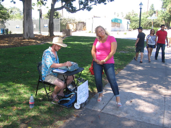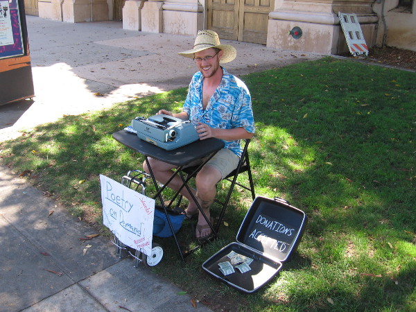 Danny was perched in front of an old manual typewriter by the entrance to the Casa Del Prado Theater. Inspired words were pouring (pounding?) out from his fingertips for curious passersby. I peered over his shoulder at sudden lines of truth. We talked just a little. We shared some experiences. I could tell in an instant that Danny loves writing and life’s endless mystery.