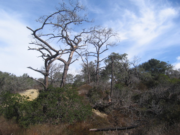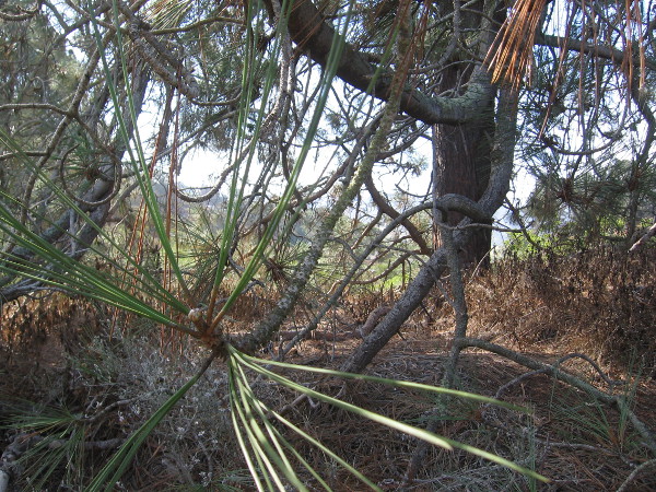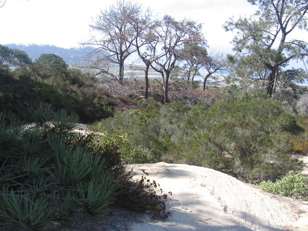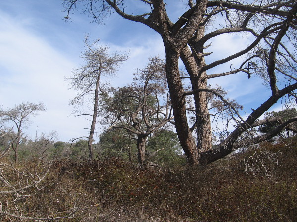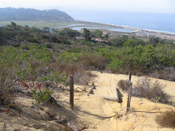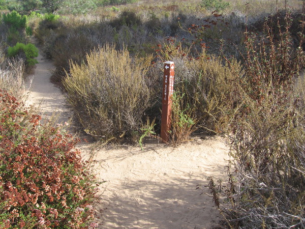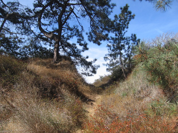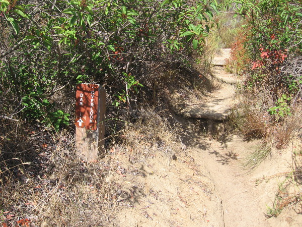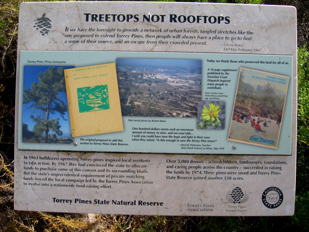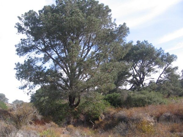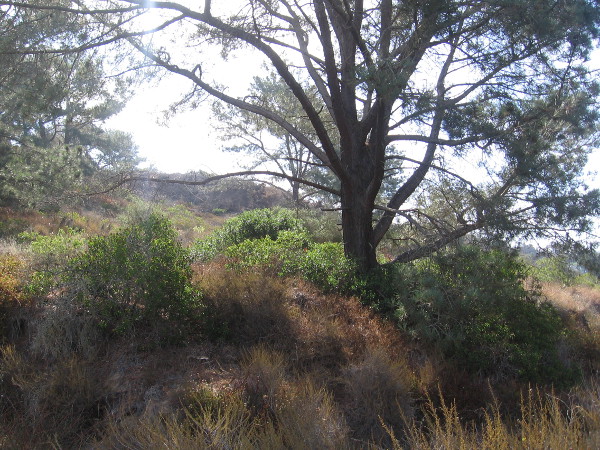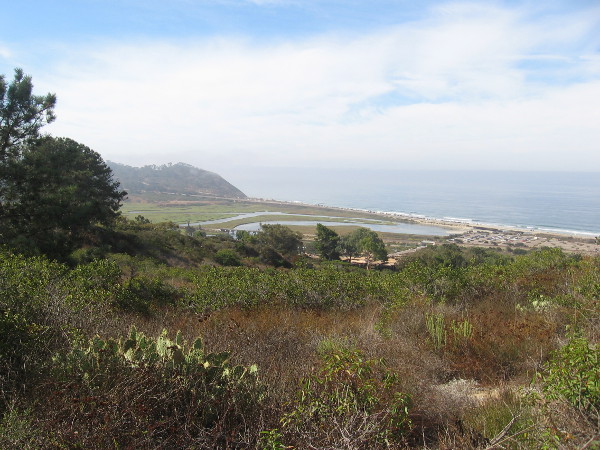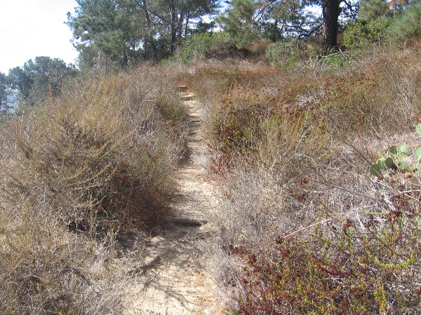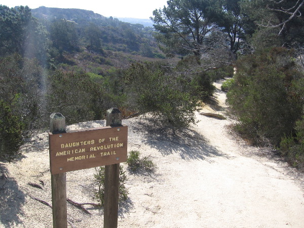 When I reached the trail junction where one turns to reach the DAR plaque, I elected to continue west downhill for a short distance, just to enjoy the amazing scenery. Beyond picturesque Torrey Pine trees stretched the wide blue Pacific Ocean and Torrey Pines State Beach.