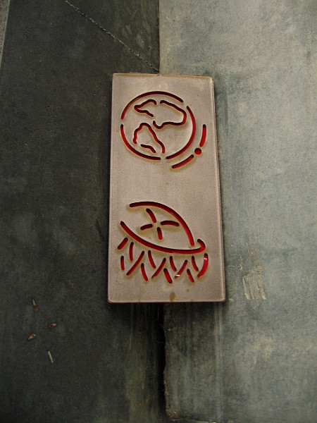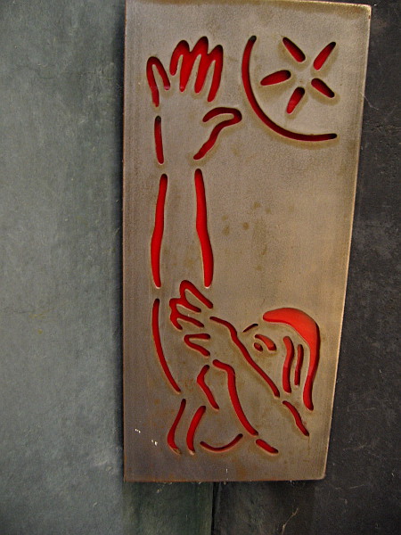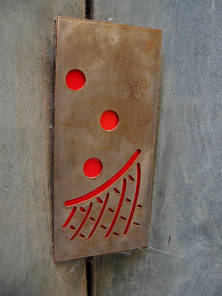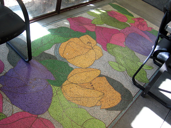 In 1996, I was invited to be part of the design team for the Balboa Park Activity Center with architects Rob Wellington Quigley, Richard Blackman, landscape architect Martin Poirier and artist Raul Guerrero. It was a most rewarding collaboration. In April 1999, I completed five installations of my work, which are integral to the building. There are twenty-five drawings in terrazzo squares (@ 16″ x 16″), titled The Circle and the Self: A Picture Story in the south plaza (1); leaf “paintings” with shadows etched into the double glass panes of the sliding front doors (2); two terrazzo floor “paintings” in the entrance lobby at the reception desk and window wall (3′ x 20′ and 5′ x 11′) of, respectively, 26 colors and 68 color/chip combinations (3); and seventy-two metal plates at the corner connections of the gymnasium – these are another translation, by flame-cut drawing in steel, of The Circle and the Self: A Picture Story (4).