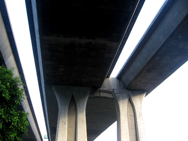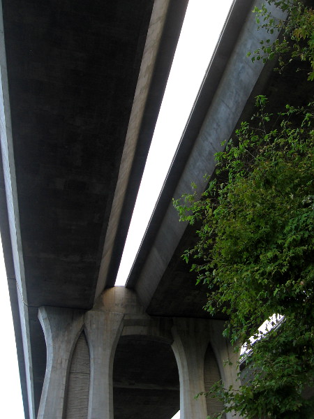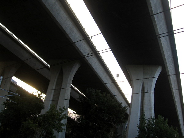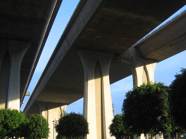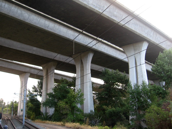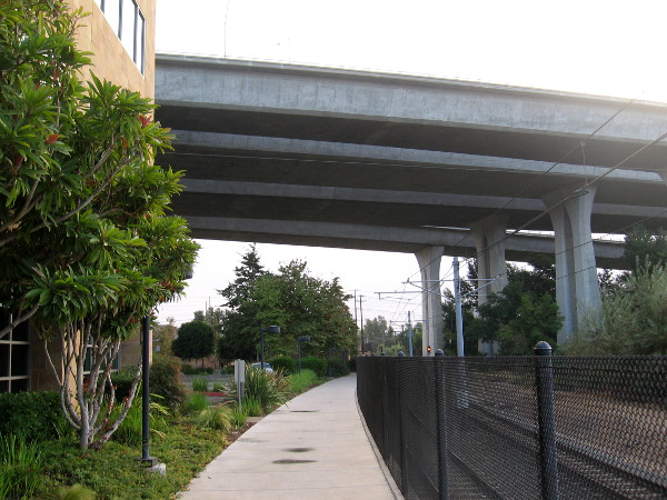 The concrete walkway leads behind the Marriott Mission Valley and several large, gleaming office buildings and finally terminates by a parking lot directly beneath the very impressive I-805 freeway bridge.