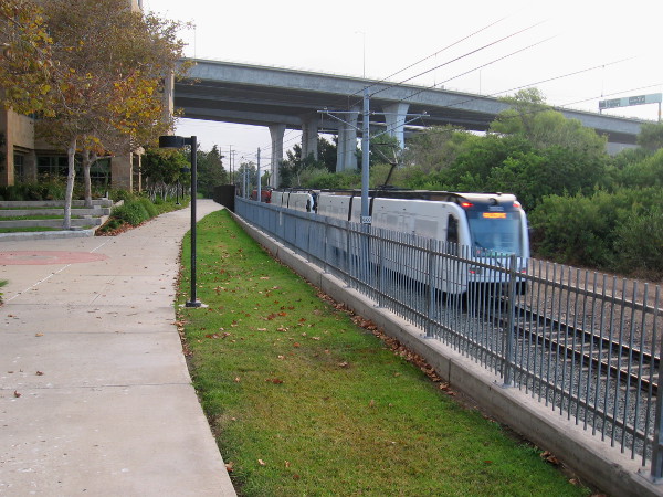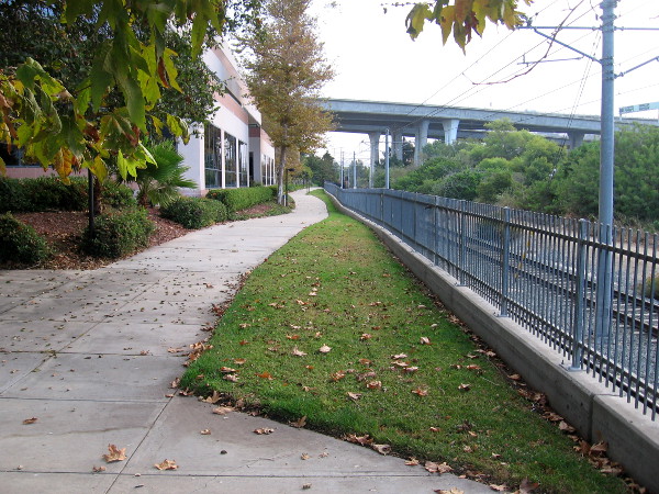 Yesterday morning I jumped off the Green Line trolley at the Rio Vista station. I walked east over Qualcomm Way via the pedestrian bridge then continued down the little-used walkway that runs parallel to the trolley tracks.