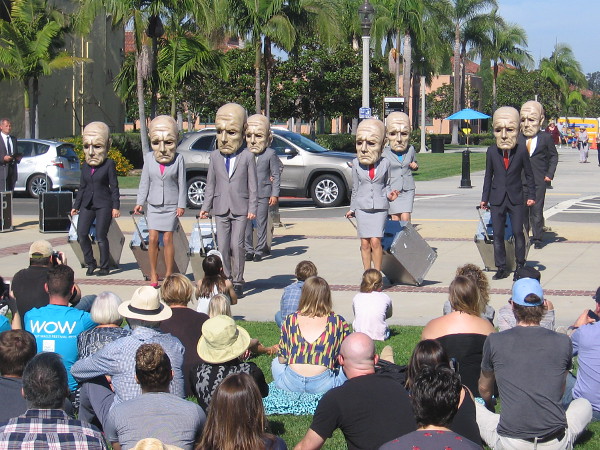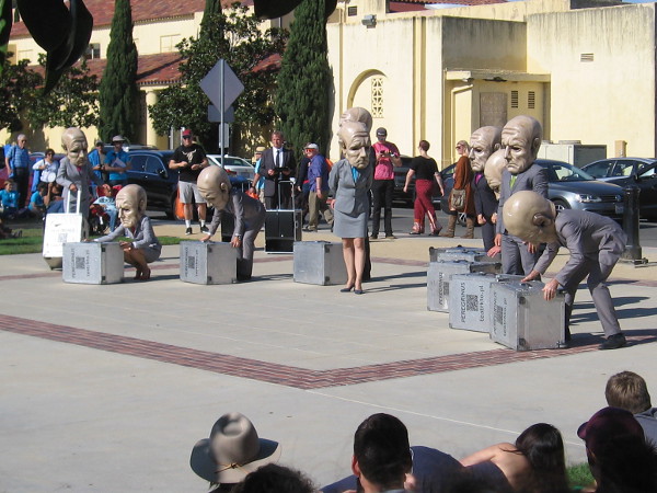 The actors bowed before their enormous masks, inserted their heads, rose up in a row, and suddenly each head was identically serious, grim, tired and sad. They filed about in a circular hurry, did the corporate dance, bowed to their boss, became jackasses when commanded to do so, engaged in power plays and subterfuge–you know, all that ridiculous, demeaning stuff that pains the heart when people shed their dignity in their desire for power, position or money.