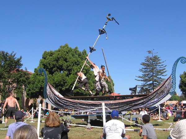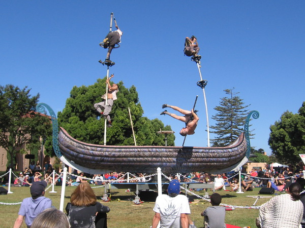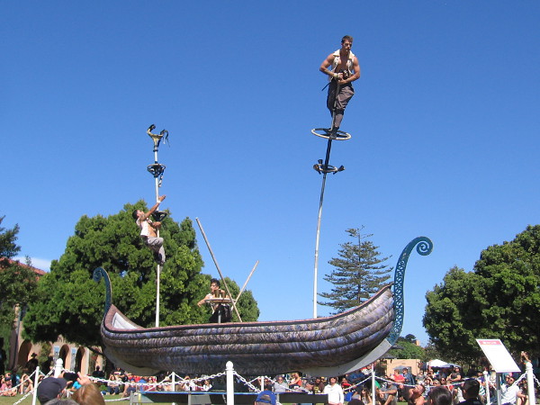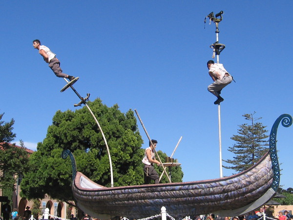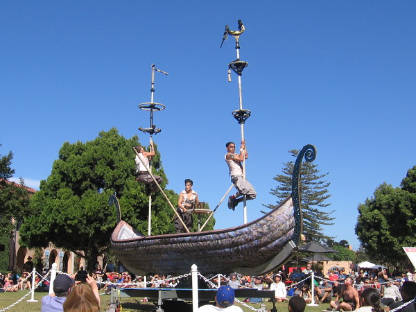 The first production I watched, titled Tall Tales of the High Seas, was a very unique visual drama that seemed part circus act, part aerial dance. The athletic performers raised the flexible masts of a rotating Viking longship, then climbed skyward to dip, fly and swerve through the sky! One could sense a bit of a story unfolding as the ship seemed to become lost at sea and the actors hung limp from the crow’s nests without hope; then land is sighted and excitement takes hold!