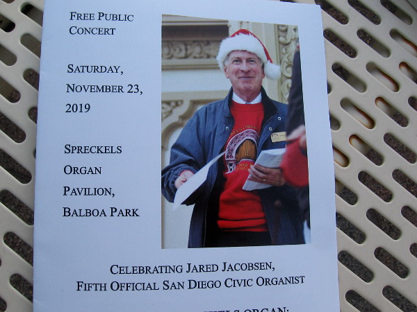 This evening there was a special concert at the Spreckels Organ Pavilion in Balboa Park. Former Civic Organist Jared Jacobsen was celebrated.