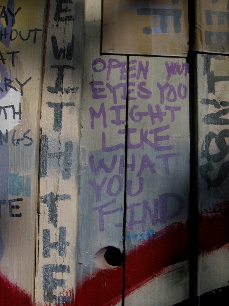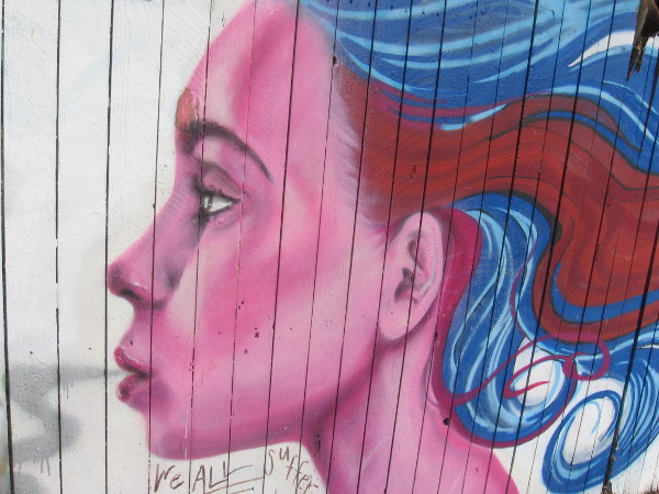 Many phrases are written inside the mural’s abstract human faces. The words–which together read like a two dimensional poem or stream of consciousness–are raw and very real.