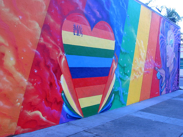 I spotted a new mural in Hillcrest at the corner of University and Third Avenue! A rainbow heart and glamorous face decorate one wall of Urban MO’s Bar and Grill.