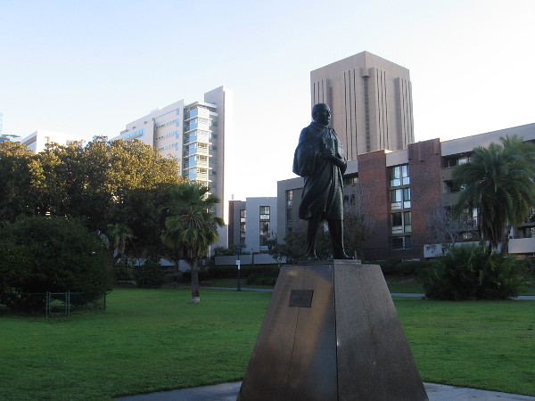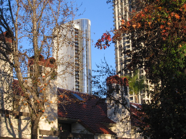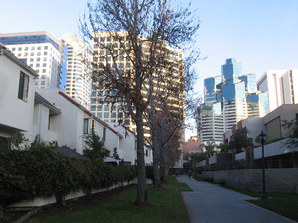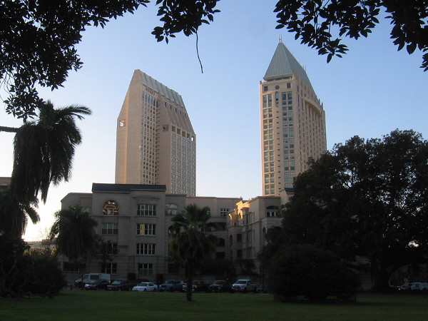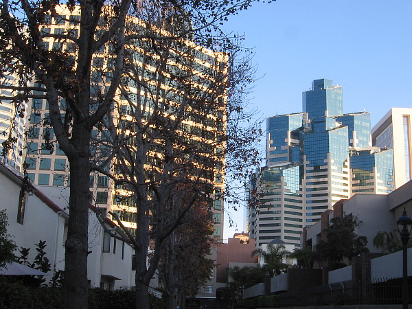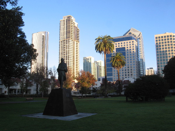 On a clear morning, viewed from Pantoja Park, many of the highest buildings in downtown San Diego shine brightly. Particularly those that rise north and northwest of the park.