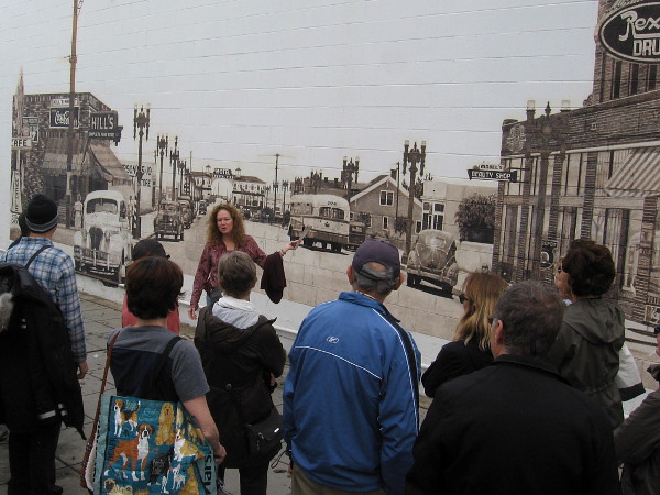 Today’s amazing tour began in a small courtyard area behind Randall’s Sandals on Garnet Avenue, where we learned from Leslie Dufour about the history of murals, particularly their early 20th century renaissance in Mexico led by artists Diego Rivera, José Clemente Orozco and David Alfaro Siqueiros. That movement continues to influence muralists today.