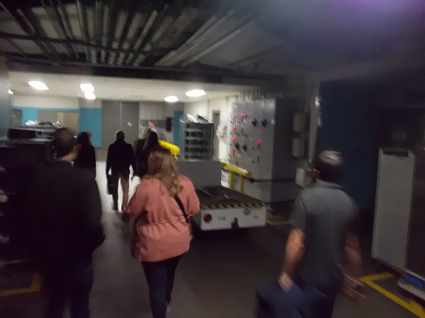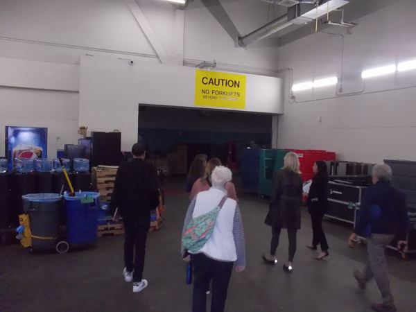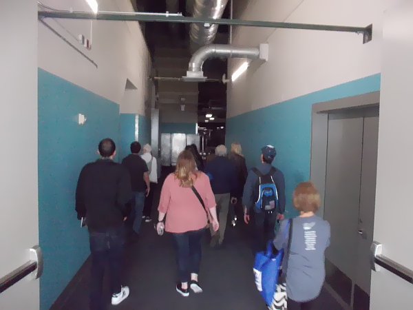 During the whirlwind tour our group saw many areas throughout the convention center, in both the iconic original structure and the later Phase 2 addition. We poked our noses into a vast hall where a new technology convention was being set up (no photos allowed), headed up an escalator one level, walked through the Sails Pavilion and a large ballroom, then took a freight elevator down to one of two huge loading docks. We walked through service corridors, got to see the convention center’s kitchen, and we learned about the logistics required to smoothly run such a mind-boggling operation.