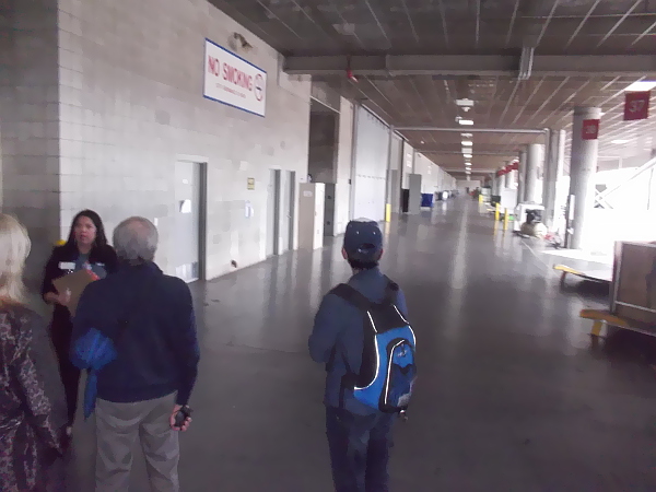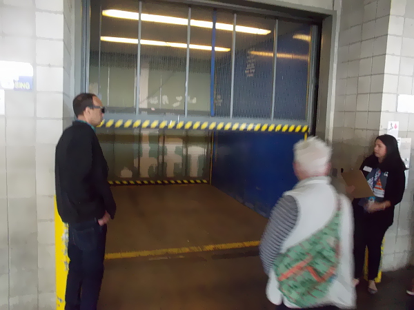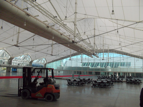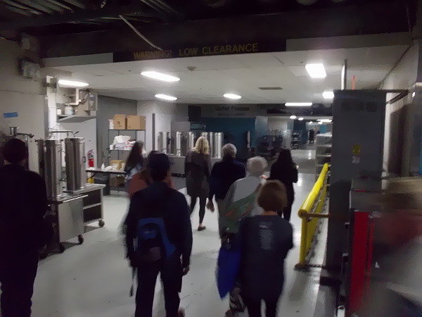 During the whirlwind tour our group saw many areas throughout the convention center, in both the iconic original structure and the later Phase 2 addition. We poked our noses into a vast hall where a new technology convention was being set up (no photos allowed), headed up an escalator one level, walked through the Sails Pavilion and a large ballroom, then took a freight elevator down to one of two huge loading docks. We walked through service corridors, got to see the convention center’s kitchen, and we learned about the logistics required to smoothly run such a mind-boggling operation.