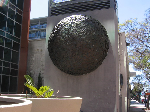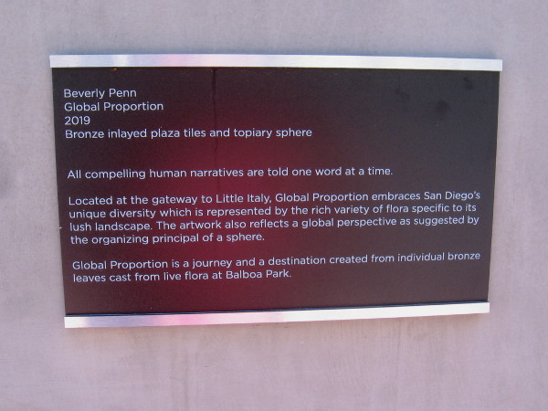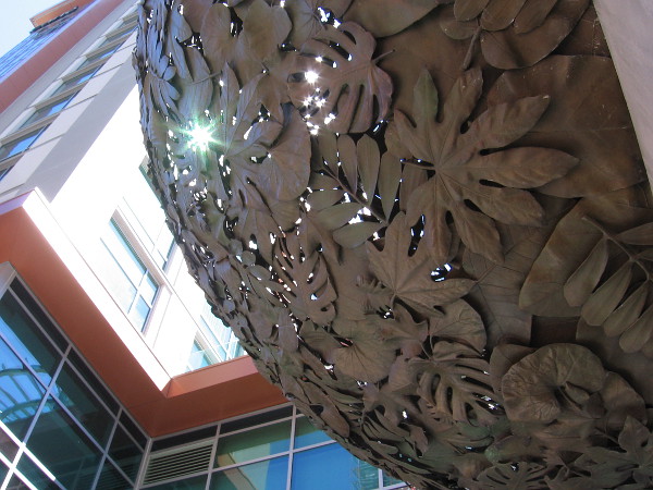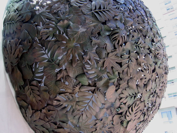 Created by artist Beverly Penn in 2019, the bronze “topiary sphere” is described as “a journey and destination created from individual bronze leaves cast from live flora at Balboa Park.”