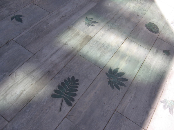 Below the amazing bronze topiary sphere, inlaid plaza tiles represent fallen leaves, scattered by the wind.