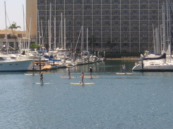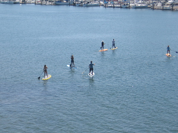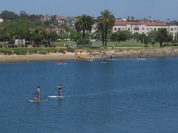 As I arrived at Liberty Station, I noticed many stand up paddleboarders embarking on a journey from the boat channel. They headed under the Nimitz and Harbor Drive bridges and into the sunlit marina behind Harbor Island.
