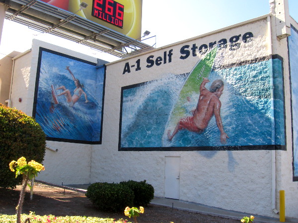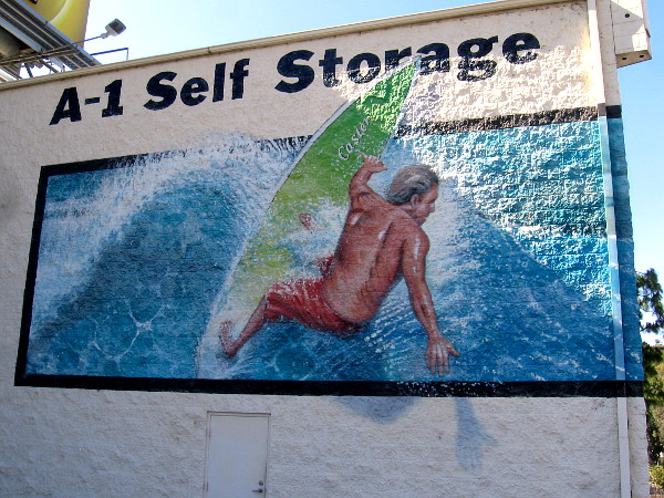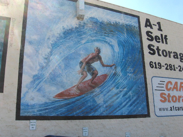If you live in San Diego, it’s likely you’ve seen these three cool surfing murals. You can glimpse them beside Interstate 8 as you drive west toward Mission Valley through Grantville. They are painted on the A-1 Self Storage building.