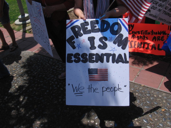 Today I walked around downtown. I came upon a political rally at the County Administration Building. Roused citizens, desiring liberty, were chafing at the slow reopening of society during the ongoing coronavirus pandemic. They expressed their reasons. They yearned for individual liberty. But others in our society yearn for collective security. It’s that never-ending political conflict.