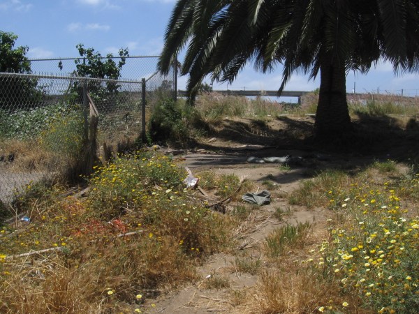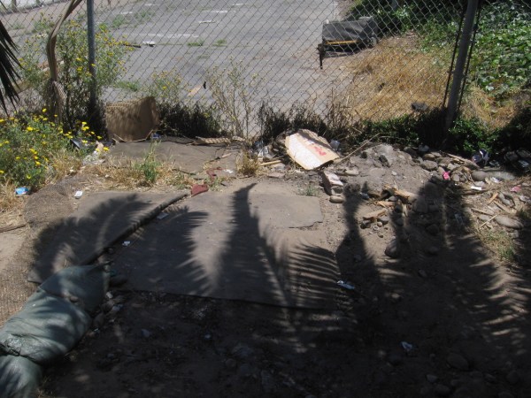 Well, look what I saw today. The wooden tombstone is gone. There’s some sort of covering and efforts at erosion control around the place where it stood. Was there a grave? Nearby I also observed objects that might be related to the Mid-Coast Trolley extension construction over Friars Road, and possible homeless activity.